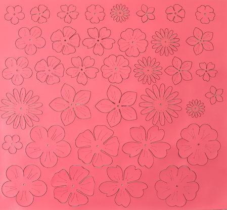 Foglio di eco pelle pretagliato con 36 fiorellini in varie forme e dimensioni.