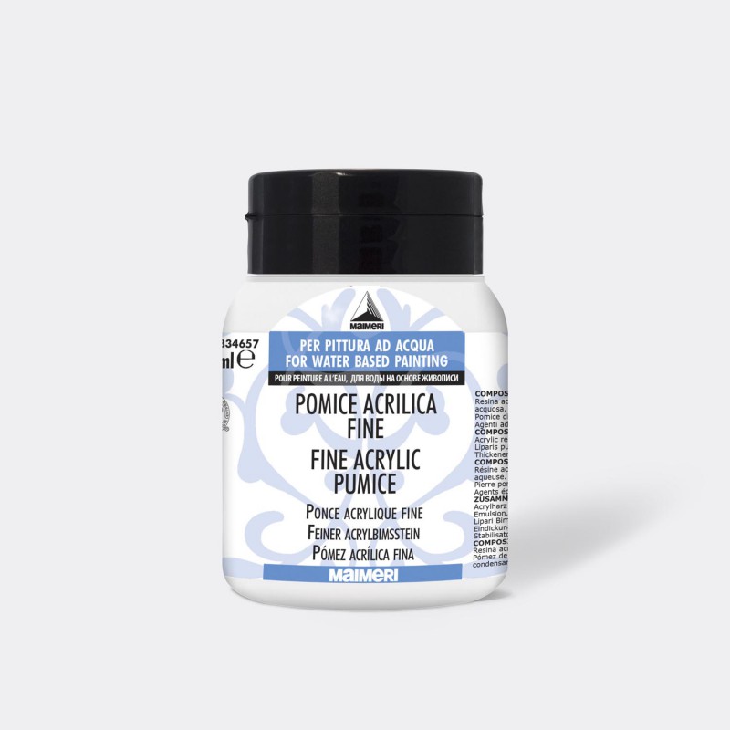 Resina acrilica in emulsione acquosa; Pomice di Lipari; Agenti addensanti e stabilizzanti.Pasta densa di colore grigio. Consente di ottenere particolari effetti materici sabbiosi simili a quelli che caratterizzano gli affreschi. Conferisce una finitura opaca, un aspetto ruvido. Molto elastica, non crepa durante l’essiccazione. Consente di ottenere alti spessori modellabili con un peso relativamente basso. Si miscela con acrilici, tempere, acquerelli. Si usa pura e si dipinge dopo l’essiccazione. Forma una superficie porosa molto ricettiva. Essiccazione direttamente proporzionale allo spessore applicato. Aderisce su tutte le superfici. Permette di inglobare materiali nell’opera. Il colore naturale spegne la vivacità dei colori a cui è miscelata.