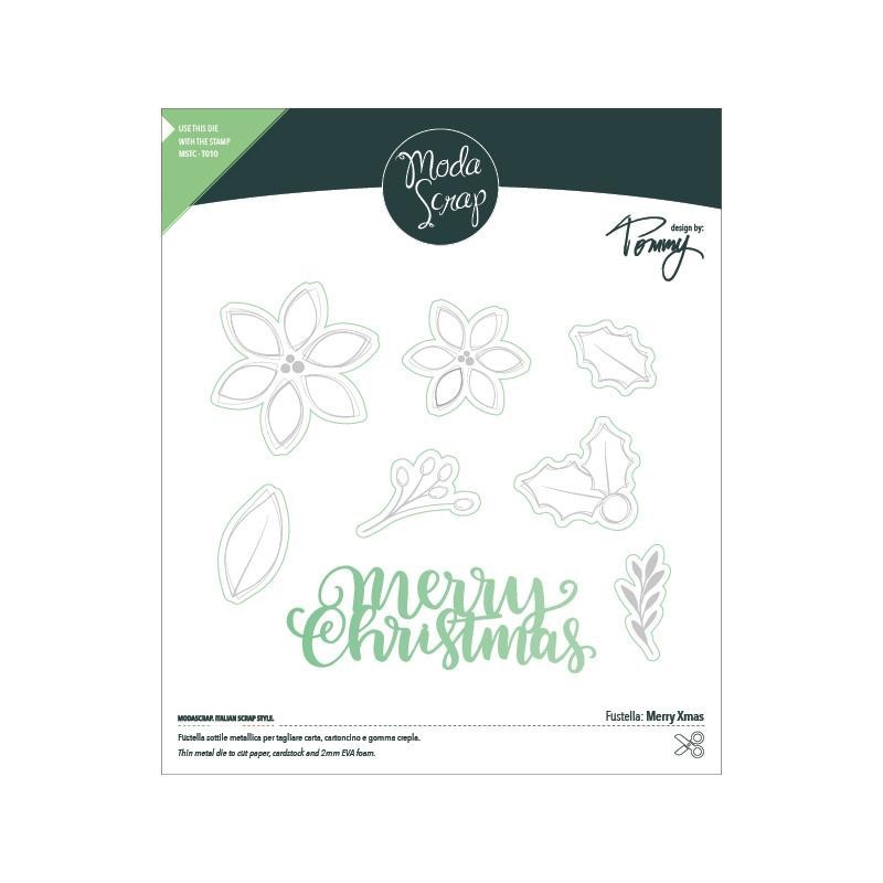 Con la fustella Merry Xmas hai la possibilità di tagliare la scritta Merry Christmas e le varie decorazioni, grazie all’abbinamento con il timbro in coordinato: MSTC T010