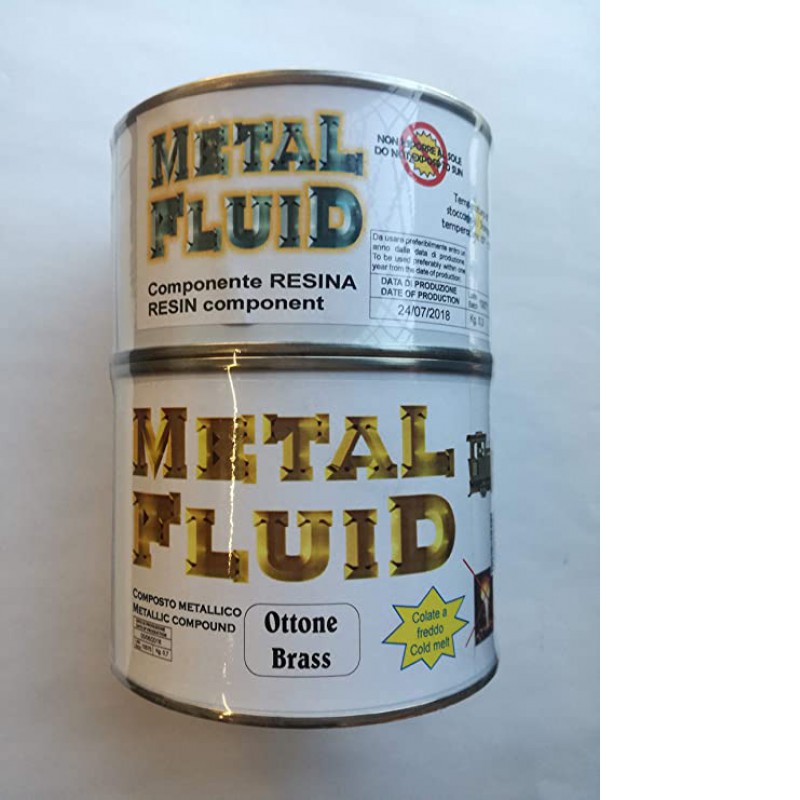 METALFLUID è un conglomerato di graniglie metalliche in legante resinoso. Viene normalmente utilizzato per colata in stampi di gomma siliconica (ma anche in stampi rigidi di pezzi relativamente semplici, privi di sottosquadro) per realizzare pezzi in metallo a freddo senza fusione. Dopo la polimerizzazione si ottiene un sinterizzato composto al 80-85% di metallo puro (l’eccesso di resina, occorsa come veicolo e affiorata in superficie, viene eliminata dopo l’indurimento). Il pezzo ottenuto dovrà poi essere carteggiato con carte ad alto numero, per eliminare la leggera patina superficiale di resina e scoprire tutta la bellezza del metallo, e lucidato con pasta abrasiva lucidante o prodotti liquidi lucidanti.