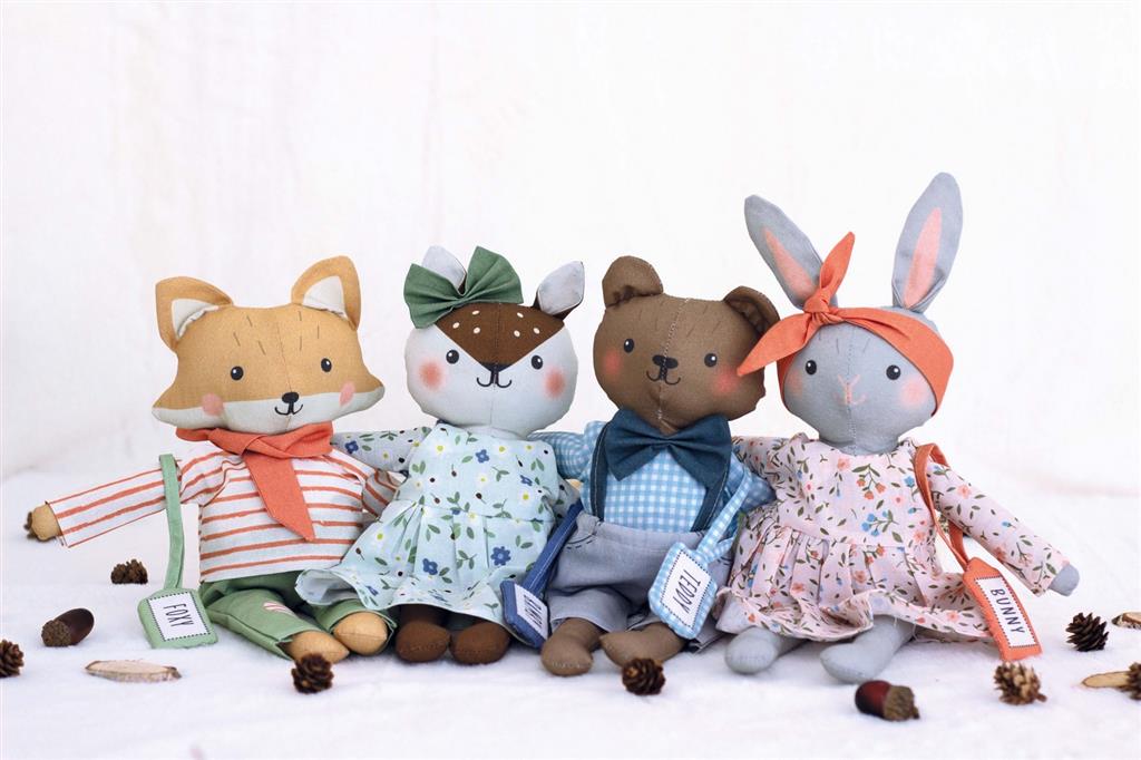 Tessuto di cotone stampato per realizzare quattro bellissimi peluche tutti perfetti per decorare la cameretta dei più piccoli.